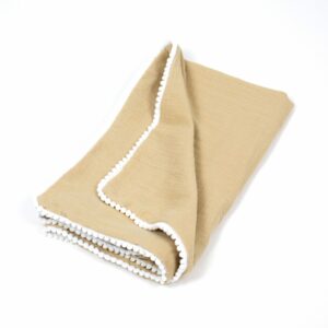 Deka je vyrobená z kombinace teploučké hřejivé bio bavlny a 100% bavlny, což zaručuje příjemný pocit na dotek a vysokou kvalitu materiálu. Po celém obvodu ji zdobí bílé kuličky, které ji dodávají jedinečný vzhled a eleganci.
