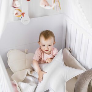 Polštář Hvězda je jasná volba, protože svým tvarem zaujme děťátko už od útlého věku. Povrch polštáře je ze 100% bavlny a je zajímavý lemem po celém obvodu. Polštář snadno sladíte s našimi ostatními textiliemi, jako jsou prostěradla, baldachýn či nebesa. K polštáři Hvězda doporučujeme koupi naší bavlněné deky, se kterou si jej materiálově i barevně dokonale sladíte.
