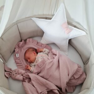 Polštář Hvězda s mašličkou je skvělá volba, protože svým tvarem zaujme děťátko už od útlého věku. Povrch polštáře tvoří 100% bavlna a je zajímavým i jemným lemem po celém obvodu. Polštář snadno sladíte s našimi ostatními textiliemi, jako jsou prostěradla, baldachýn či nebesa. K polštáři Hvězda doporučujeme koupi naší bavlněné deky, se kterou si jej materiálově i barevně dokonale sladíte.