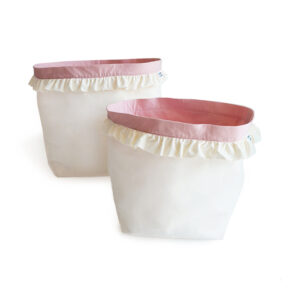 Set dvou bavlněných košíků je proto nenahraditelným pomocníkem, který unikátním a stylovým způsobem dodá dětskému království šmrnc, a zároveň zabraňuje vzniku nepořádku a chaosu. Do dětských boxů můžete uložit nejen hračky, ale také deky, dekorační polštáře a další předměty. Úložné koše do dětského pokoje jsou vyrobeny z kvalitního materiálu, kterým je 100% bavlna v kombinaci s netkanou textilií. Díky tomu koše drží svůj tvar, jsou pevné a udrží veškerý obsah bezpečně uvnitř. U našich úložných košíků si můžete vybrat barvu jak vnější, tak i vnitřní strany, což vám dodává volnou ruku při vytváření barevné kombinace přesně podle vašich představ a preferencí. Na výběr je množství barevných kombinací, z nichž si snadno vyberete tu ideální právě do vašeho interiéru. Úložné koše jsou navíc lemované stylovým volánem v barvě vnější strany.