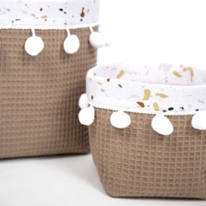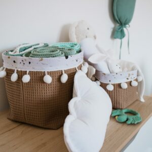 Set dvou košíků na kosmetiku je ideálním příkladem. Můžete je využít na přebalovacím pultu na uložení kosmetiky, nebo jako úložný prostor na plenky, dudlíky, chrastítka či kousátka. Jsou nejen praktickými pomocníky šetřícími místo, ale i stylovými doplňky, které zútulní dětský pokojíček. Dětské úložné košíky jsou vyrobeny z kvalitního materiálu, a to vafle bavlny a netkané textilie. Díky tomu jsou pevné, drží tvar a celý obsah bezpečně udrží pohromadě. U našich košíků si můžete vybrat barvu jak vnější, tak i vnitřní strany, což vám dodává volnou ruku při vytváření barevné kombinace přesně podle vašich představ a preferencí. Na výběr je mnoho barevných variací, z nichž si zaručeně vyberete tu pravou. Úložné koše jsou navíc lemované velkými kuličkami, jejichž barvu si také můžete zvolit.