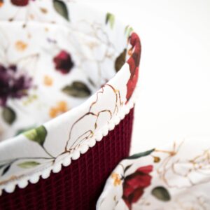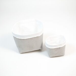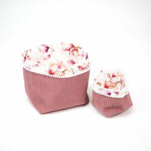 Set dvou košíků na kosmetiku je ideálním příkladem. Můžete je využít na přebalovacím pultu na uložení kosmetiky, nebo jako úložný prostor na plenky, dudlíky, chrastítka či kousátka. Jsou nejen praktickými pomocníky šetřícími místo, ale i stylovými doplňky, které zútulní dětský pokojíček. Dětské úložné košíky jsou vyrobeny z kvalitního materiálu, a to vafle bavlny a netkané textilie. Díky tomu jsou pevné, drží tvar a celý obsah bezpečně udrží pohromadě. U našich košíků si můžete vybrat barvu jak vnější, tak i vnitřní strany, což vám dodává volnou ruku při vytváření barevné kombinace přesně podle vašich představ a preferencí. Na výběr je mnoho barevných variací, z nichž si zaručeně vyberete tu pravou. Úložné koše jsou navíc lemované stylovými bílými minikuličkami.