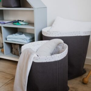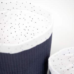 Set čtyř úložných košů (XS, S, M, L) je proto unikátním kouskem, který by v dětském pokoji neměl chybět. Větší košíky (M, L) jsou skvělé na uchování hraček a naopak menší dětské úložné boxy (XS, S) jsou ideální na uspořádání kosmetiky, plenek či jiných menších předmětů v pokoji. Úložné koše jsou vyrobeny z kvalitního materiálu, kterým je vafle bavlna v kombinaci s netkanou textilií. Díky tomu jsou pevné, drží svůj tvar a veškerý obsah udrží hezky pohromadě. U našich košíků si můžete vybrat barvu jak vnější, tak i vnitřní strany, což vám dodává volnou ruku při vytváření barevné kombinace přesně podle vašich představ a preferencí.