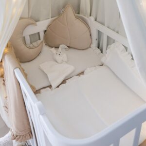 Mušelínová přikrývka s polštářem s volánem a hypoalergenní výplní potěší v postýlce nejen vaše děťátko, ale i vás.