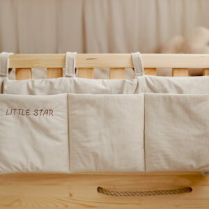 Praktický organizér – kapsář pomůže při skladování drobností, které potřebujete mít u dětské postýlky při ruce – dudlík, plenky či oblíbená hračka. Univerzální organizér se skládá ze 2 kapes. Díky uchycení pomocí suchého zipu organizér perfektně sedí na jakoukoliv postýlku (rostoucí nebo standardní). Nejen, že je suchý zip dostatečně dlouhý, díky čemuž si můžete uchycení regulovat, ale u tenkých tyčí postýlky je možné úchyt v případě potřeby omotat i vícekrát.